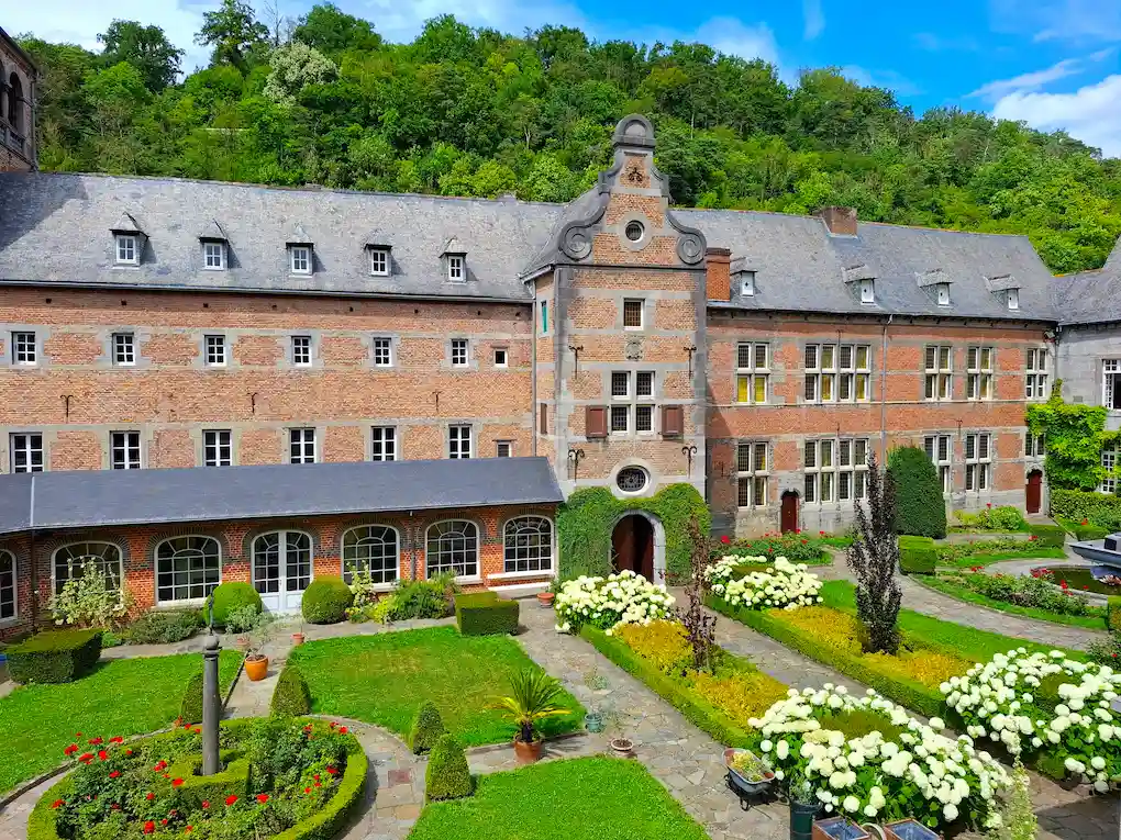 Nichée dans la vallée de la Molignée, petite rivière qui se jette dans la Meuse, l'abbaye de Maredret est située au cœur de la province wallonne (et donc francophone) de Namur en Belgique. Elle surplombe le village homonyme depuis le sommet de la colline avoisinante, entourée de bois, de prairies et de champs. Elle est commune perle cachée dans un écrin de verdure où règne un silence parfait, à l'exception du chant mélodieux des oiseaux. Cet effet de beauté et de paix ne manquera pas de vous gagner dès lors que vous aurez franchi le portail d'entrée principal. Mais de nombreux lieux vous attendent également aux alentours de l'abbaye.